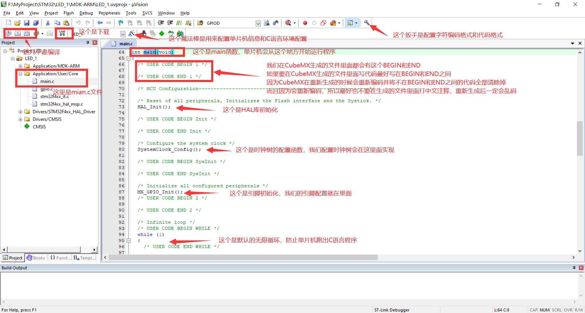 到此我已经完成了点灯功能并学习了如何用CubeMX配置时钟和GPIO创建工程,如何配置工程编译程序下载到板子上,其他类型的板子都是同理的,只要有原理图就可以。