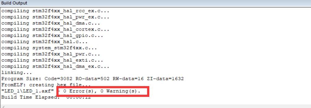 然后我们尝试编译一遍,一般按编译那里三个按键的中间那个按键或者按键盘F7也可以,一般是不会有错误或者警告的如果有就说明生成工程出了问题,建议重新生成一遍工程,确保生成流程没有一个警告