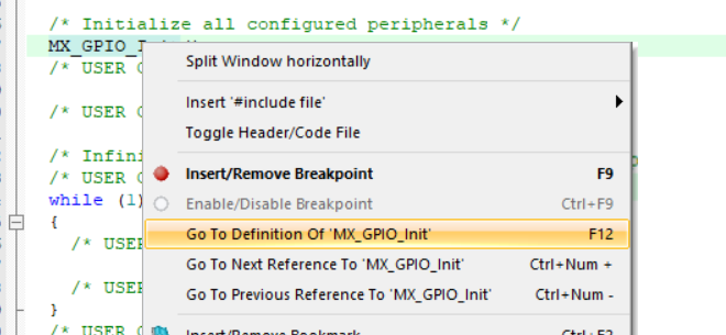 什么是函数跳转功能,就是我们不知道这个函数干了什么就可以跳转到这个函数的本体位置,直接查看函数的代码写了什么,我们拿GPIO的初始化函数举例,选中这个函数然后右键点去到定义这个函数的地方,也可以按键盘F12跳转