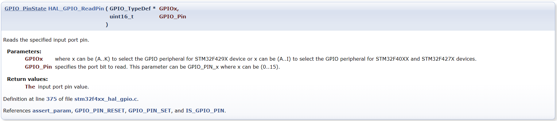 GPIO_PinState HAL_GPIO_ReadPin(GPIO_TypeDef* GPIOx, uint16_t GPIO_Pin);