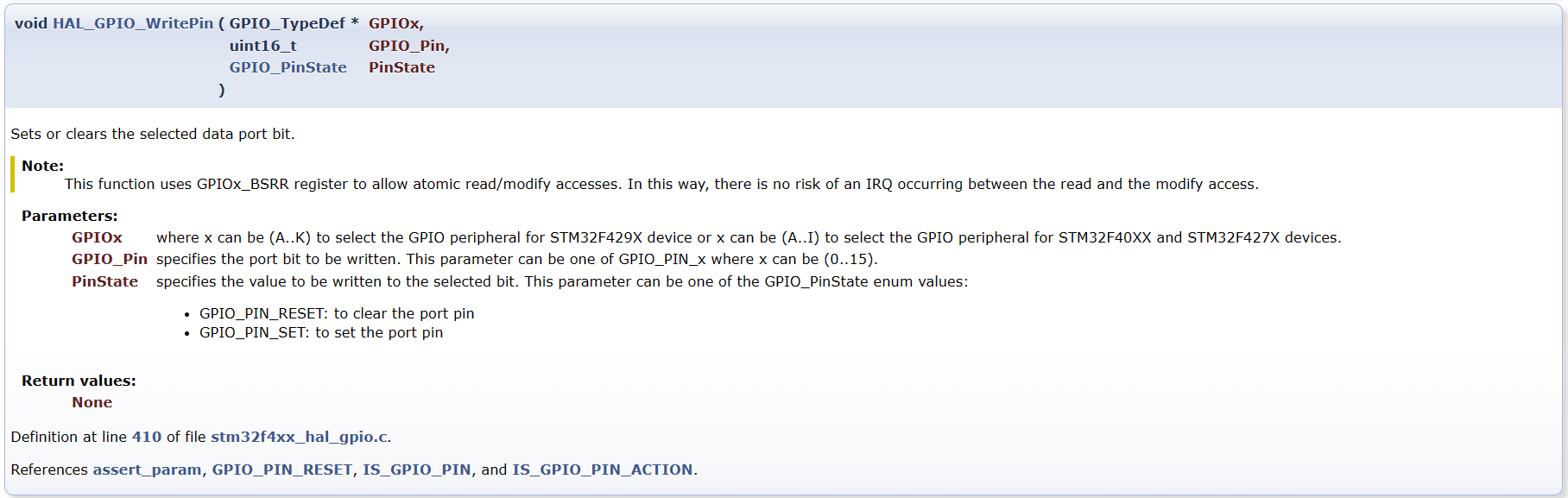 void HAL_GPIO_WritePin(GPIO_TypeDef* GPIOx, uint16_t GPIO_Pin, GPIO_PinState PinState);