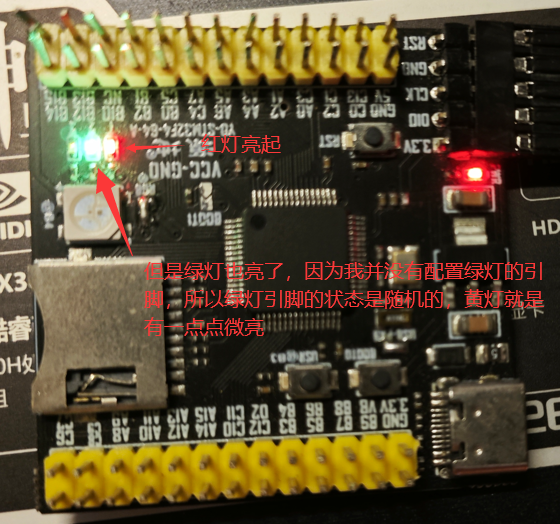 因为配置了绿黄的引脚为低电平,所以确定了引脚状态绿黄都灭掉了,只有红灯亮着,因为我将写红色引脚的函数写在了BEGIN和END之间,将红色引脚写成高电平的函数还在所以程序会将红色灯点亮