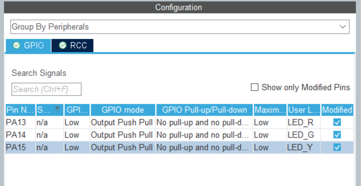 先查看原理图,选择LED所在的引脚,可以看到红色LED灯是PA13,绿色是PA14,黄色是PA15,可以看出LED的阴极接了地,电流流向是从左到右的,所以引脚如果输出高电平相应的LED就会亮,反之输出低电平就会灭