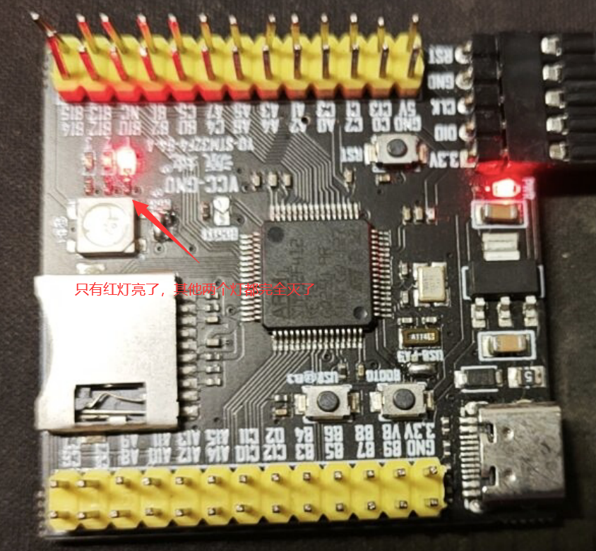 然后再编译下载到板子上然后按下复位就可以看到红灯亮起