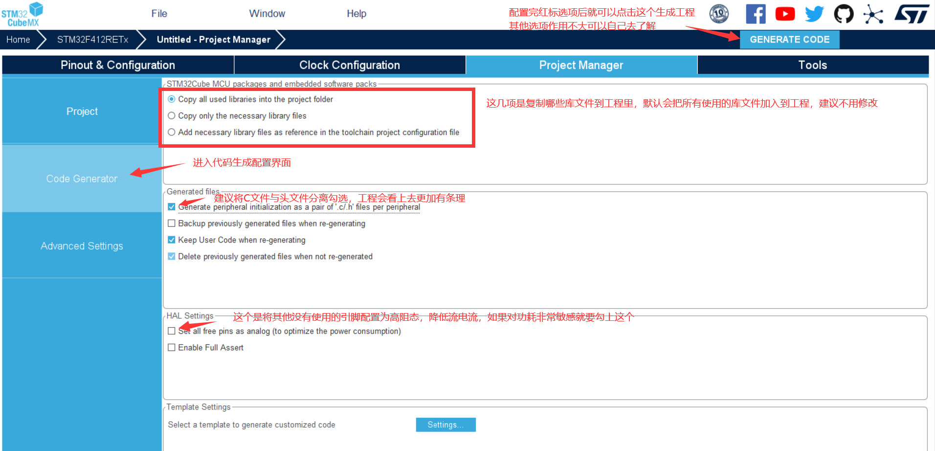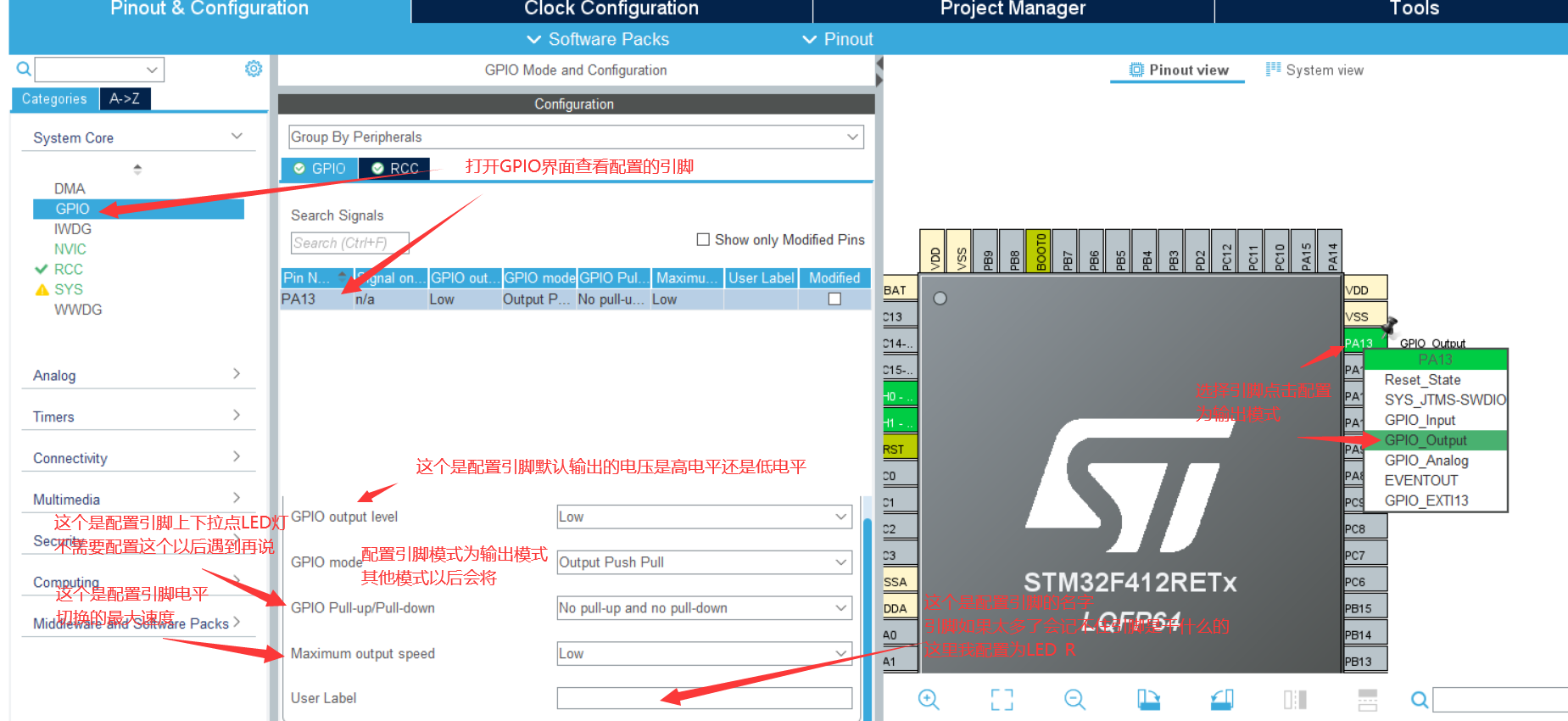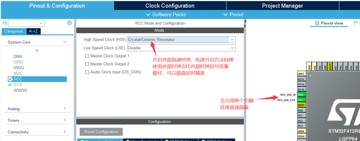 输入STM32F412RET6后双击STM32F412RET6打开芯片配置界面