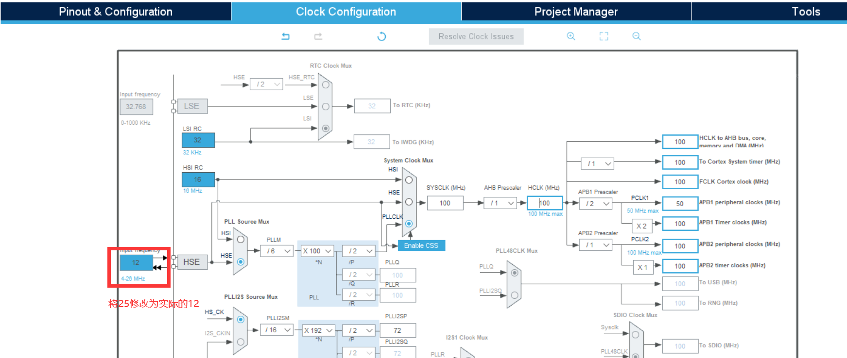 配置时钟树,直接将性能拉满,注意一个小细节我选择的开发板上外部焊接的晶振是12MHz,需要进行修改