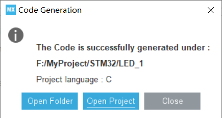 生成工程后会弹出这个,右边按键的打开工程文件夹,中间是用Keil5打开工程,右边是关闭这个弹窗